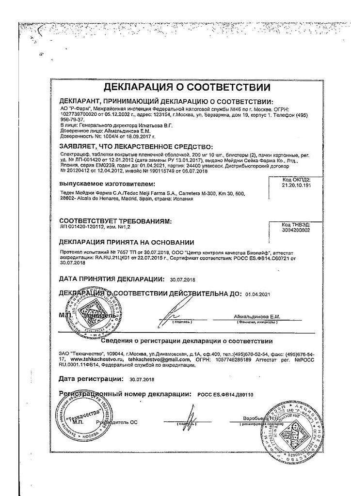 Спектрацеф - цефалоспорин III поколения. Цефдиторена пивоксил — полусинтетический бета-лактамный антибиотик, является пролекарством цефдиторена (цефалоспорин третьего поколения). Механизм действия препарата связан с ингибированием синтеза бактериальной стенки благодаря его сродству с пенициллинсвязывающими белками. Оказывает антибактериальное действие.