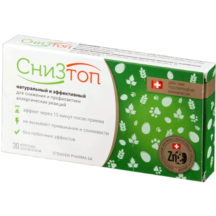 Показания. Рекомендовано купить СниЗтоп с целью снижения сезонных и круглогодичных проявлений аллергии: аллергический насморк, ощущение зуда полости носа и в глазах, покраснение глаз, слезотечение, заложенность носа. Также СниЗтоп может быть рекомендован в качестве биологически активной добавки к пище – дополнительного источника цинка.