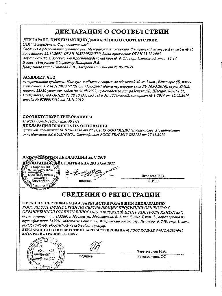 1 таблетка Нексиум 40 мг содержит: активное вещество: 44,50 мг эзомепразола магния тригидрата, что соответствует 40 мг эзомепразола.