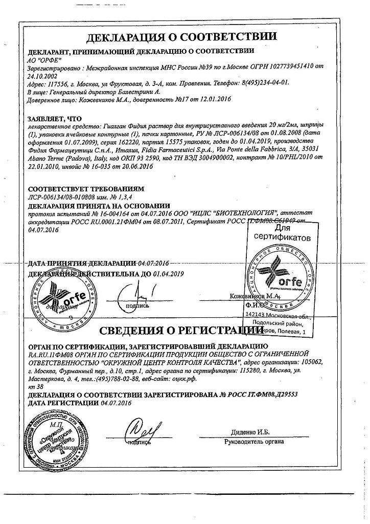 1 мл раствора Гиалган содержит натрия гиалуроната 0,01 г. Аддитивные компоненты: натрий фосфорнокислый 2-замещенный, натрия дигидрофосфата дигидрат, натрия хлорид, вода стерильная.