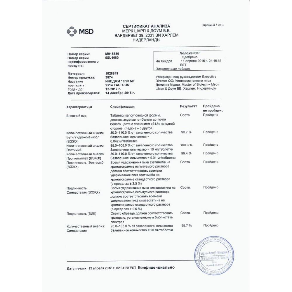 Инеджи - комбинированное гиполипидемическое средство, которое снижает абсорбцию холестерина и родственных растительных стеролов в кишечнике, а также подавляет эндогенный синтез холестерина. Препарат содержит эзетимиб и симвастатин, два гиполипидемических компонента с механизмом действия, которые дополняют друг друга. Инеджи снижает повышенный уровень общего холестерина (ХС), холестерина липопротеидов низкой плотности (ХС ЛПНП), аполипопротеида В (апо-В), триглицеридов (tг) и холестерина липопротеидов промежуточной плотности (ХС ЛППП) и повышает уровень холестерина липопротеидов высокой плотности (ХС ЛПВП ) путем двойного действия - угнетение абсорбции и синтеза холестерина.
