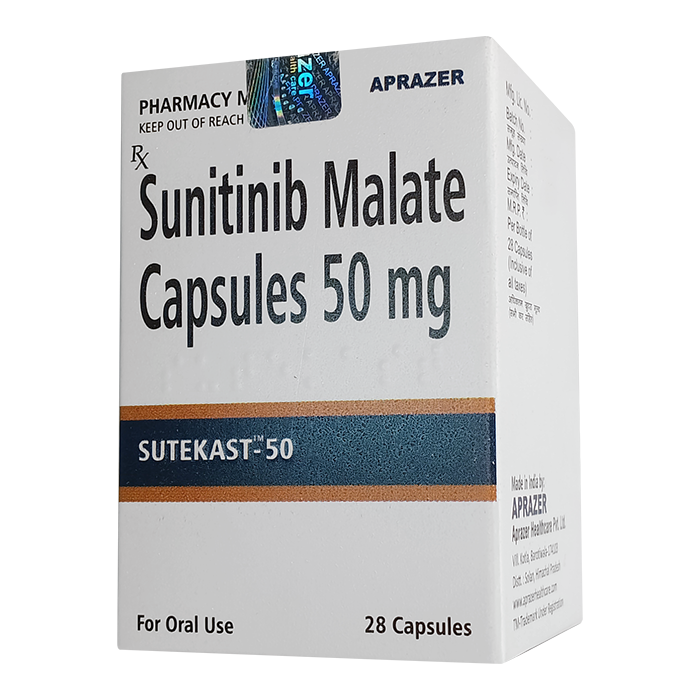 Ингибитор мультикиназы Сунитиниб выпускается под торговой маркой Sutekast от Aprazer. Сунитиниб ингибирует активность киназы как в опухолевых клетках, так и в опухолевых сосудах. Рецепторы тирозинкиназы VEGFR1-3, PDGFR и C-Kit блокируются.