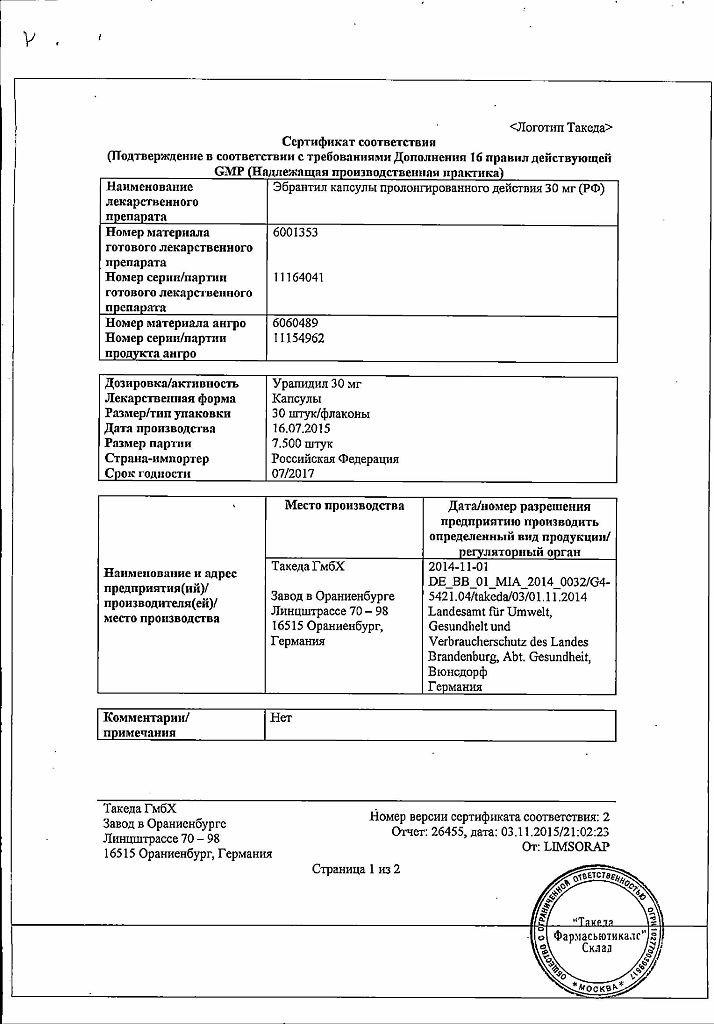 1 капсула содержит: 30 мг урапидила.