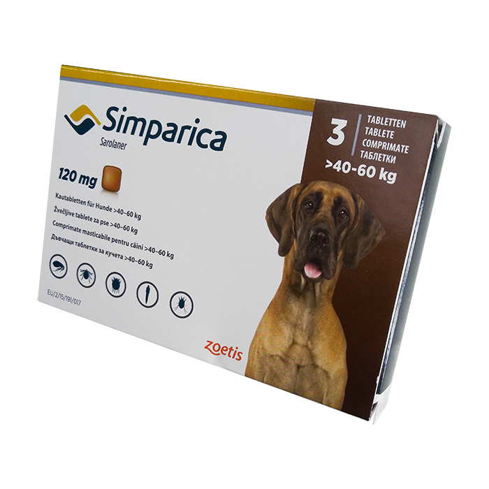 Симпарика – средство для лечения и профилактики паразитарных инфекций у собак. Препарат выпускается в форме таблеток для перорального применения, предназначен для собак весовой категории 40-60 кг. Каждая упаковка содержит 3 таблетки по 120 мг.